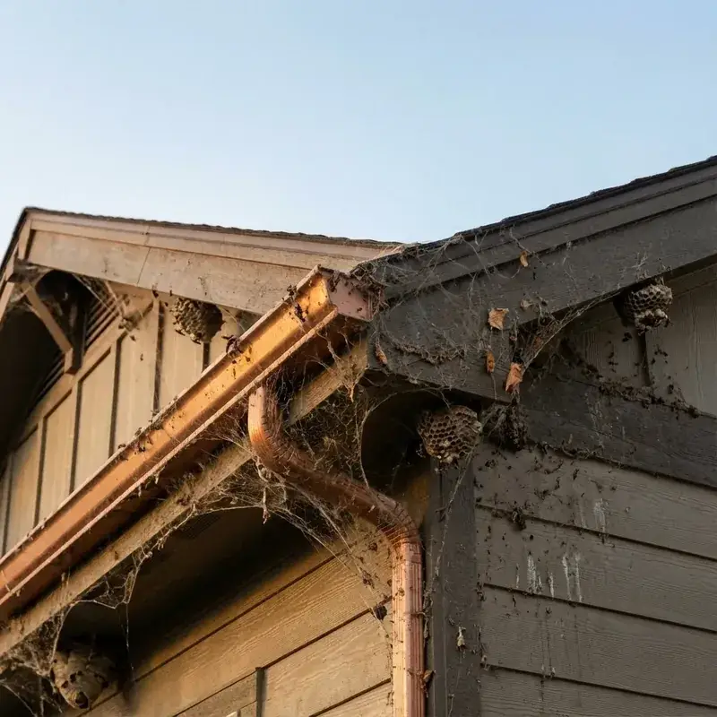 Untreated homes in Boise accumulate heavy spider webbing, wasp nests, and debris in eaves. This not only looks neglected but invites spiders inside.